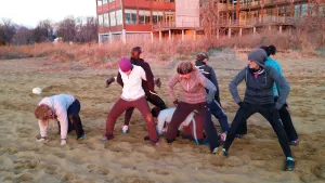 (Group size: 1+) http://www.gamesfitness.com/2015/01/throw-go/ Each person has a medicine ball or sandbag. They push/throw it as far as possible using a chest pass. Race or Relay. Repeat until reaching the finish line 👜